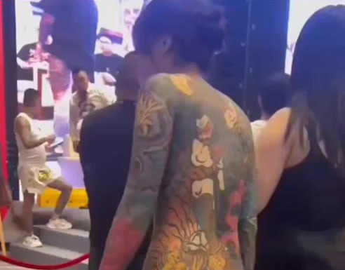 2025合肥纹身展 女生组选手表演才艺时 黑色纱衣女子直接跨坐在男评委大腿上 动作暧昧十足!