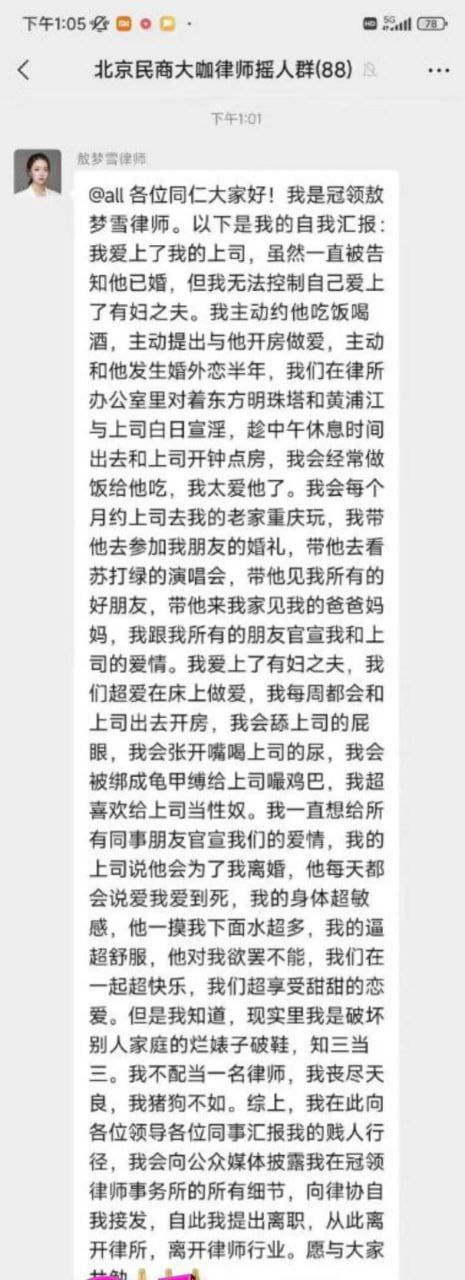 女律师敖梦雪出轨勾引上司事件持续发酵,官方确认细节令人瞠目。炸裂的是之前爆料说原配酒店捉奸逼迫敖梦雪当场在群里发忏悔书,没想到此次知情人士爆料,竟是原配冒充敖梦雪在社交群中发布多段不雅视频和照片!这场突如其来的风波不仅摧毁了一个法律工作者的事业,更让人不禁对道德底线的缺失感到忧虑!从下方图片可见原配手段的高明之处,长篇的忏悔书彻底毁掉了敖梦雪的人生!文章中表示一切都是其为上位勾引的自己上司!而且言语之中的尺度非常之大!把敖梦雪形容成一个不要脸的贱婊!果然女人不可得罪啊!真可谓蛇蝎心肠啊!