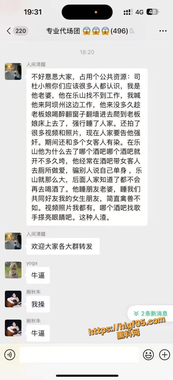 司杜小熊,这位在四川乐山和阿坝州酒吧混饭吃的助唱歌手,本以为靠甜言蜜语就能骗天骗地,谁知老婆忍无可忍,直接在大群里甩出他的性爱视频和照片。老婆爆料,这畜生来阿坝州没几天,就翻墙爬窗潜入老板娘卧室,趁她醉倒时强行上床,拍下全过程,现在老板娘气炸要告他强奸。司杜小熊平时在台上唱情歌,台下却像头野兽,骗女客说他单身,带到厕所就扒裤子直捣黄龙。