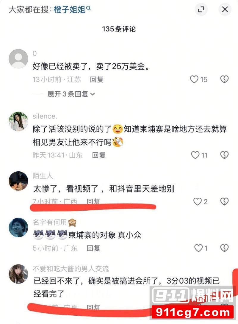 抖音网红 橙子姐姐 柬埔寨失联事件 被男友以25W美金卖到园区后以200美金一次接客出售视频曝光!