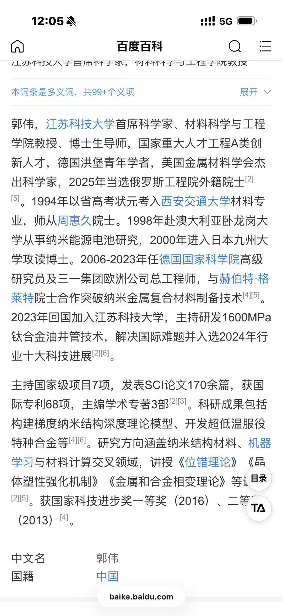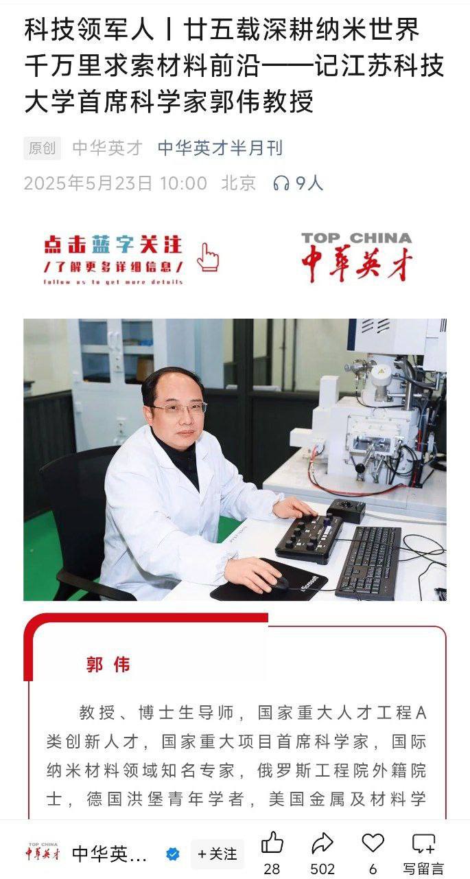 江苏科技大学首席科学家郭伟,国际纳米材料领域璀璨巨星,教授,博士生导师,一本院校的学术泰斗,头顶无数光环闪耀!他以纳米复合材料创新闻名全球,SCI论文堆积如山,基金项目拿到手软,俨然是材料科学界的中国骄傲。从实验室白大褂到高端论坛西装革履,郭伟的人生轨迹如火箭般飙升,背后是层层包装的顶尖专家神话,吸引亿万资金倾注,团队蒸蒸日上,前途无限风光!谁知风云突变,这位学术之光竟被带走调查,涉嫌欺诈黑幕层层剥开!网友炸锅,高中学历的状元如何摇身一变为国际大牛?伪造履历,拼凑成果的惊天骗局,即将浮出水面,学术界震动,圈内人倒吸凉气,这出大戏才刚拉开帷幕,更多爆点等你深挖!