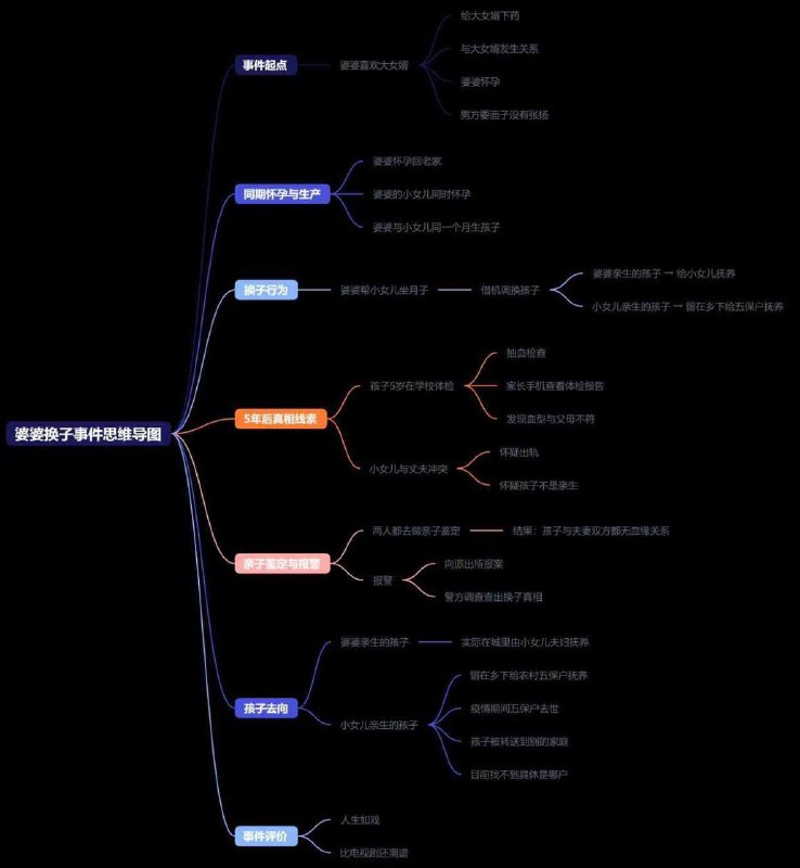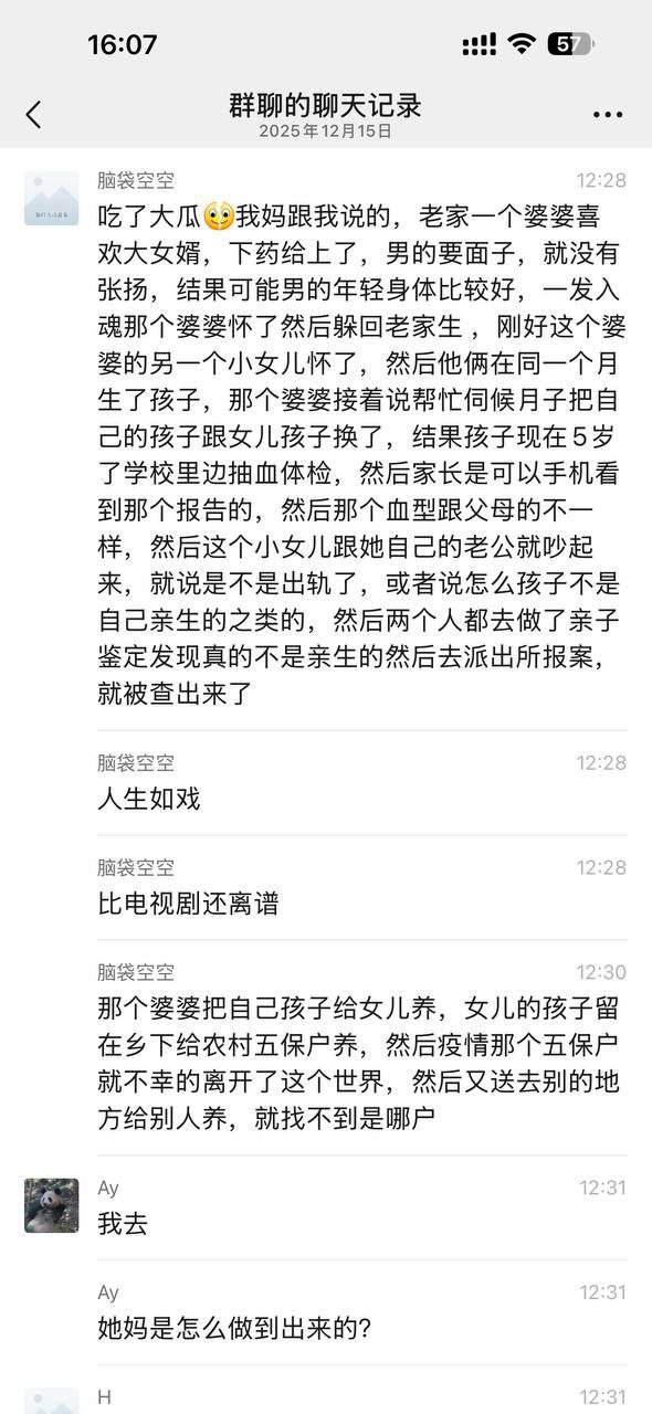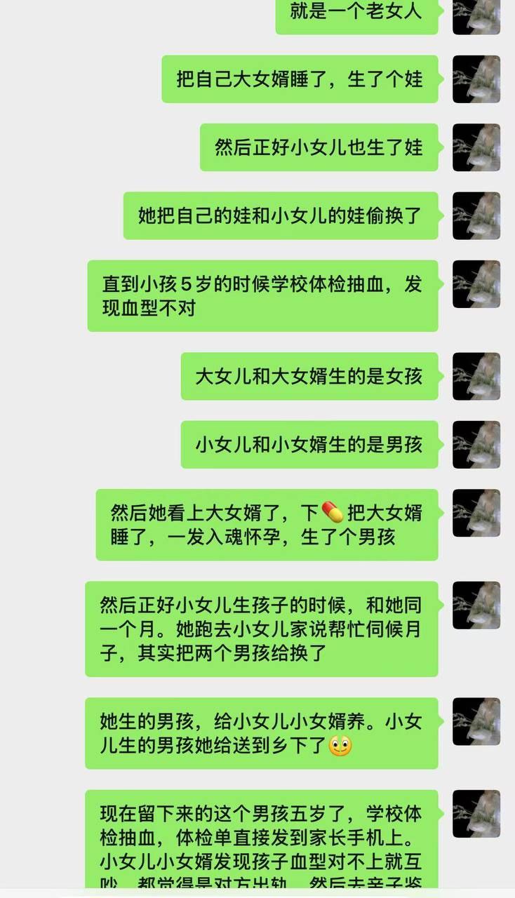 我妈跟我说的,老家一个婆婆喜欢大女婿,下药给上了,男的要面子,就没有张扬,结果可能男的年轻身体比较好,一发入魂那个婆婆怀了然后躲回老家生 ,刚好这个婆婆的另一个小女儿怀了,然后他俩在同一个月生了孩子,那个婆婆接着说帮忙伺候月子把自己的孩子跟女儿孩子换了,结果孩子现在5岁了学校里边抽血体检,然后家长是可以手机看到那个报告的,然后那个血型跟父母的不一样,然后这个小女儿跟她自己的老公就吵起来,就说是不是出轨了,或者说怎么孩子不是自己亲生的之类的,然后两个人都去做了亲子鉴定发现真的不是亲生的然后去派出所报案,就被查出来了