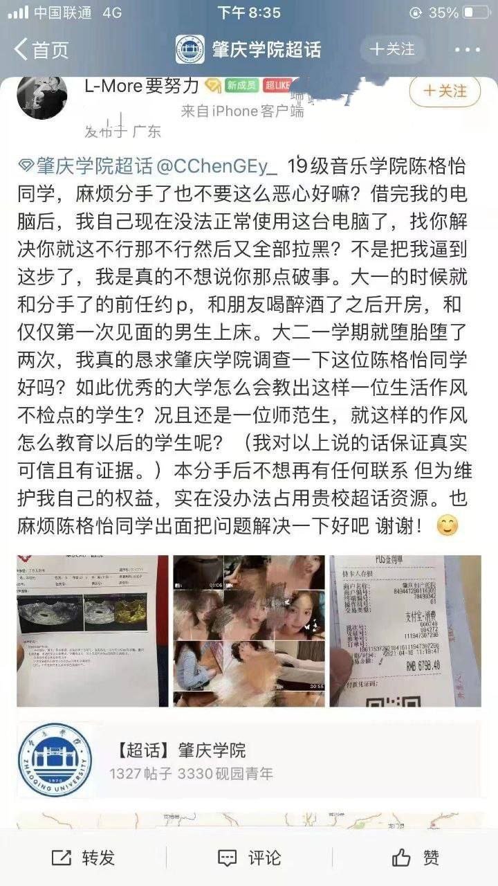 肇庆19级音乐学院陈格怡同学,麻烦分手了也不要这么恶心好嘛?借完我的电脑后,我自己现在没法正常使用这台电脑了,找你解决你就这不行那不行然后又全部拉黑?不是把我逼到这步了,我是真的不想说你那点破事。大一的时候就和分手了的前任约p,和朋友喝醉酒了之后开房,和仅仅第一次见面的男生上床。大二一学期就堕胎堕了两次,我真的恳求肇庆学院调查一下这位陈格怡同学好吗?如此优秀的大学怎么会教出这样一位生活作风不检点的学生?况且还是一位师范生,就这样的作风怎么教育以后的学生呢?(我对以上说的话保证真实可信且有证据。)本分手后不想再有任何联系但为维护我自己的权益,实在没办法占用贵校超话资源。也麻烦陈格怡同学出面把问题解决一下好吧
